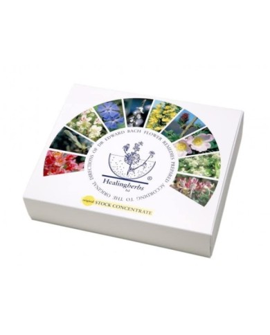 Set di 40 bottigliette da 10ml (stock bottle), comprendente le 38 essenze dei Fiori di Bach, da Agrimony a Willow, ed in più due bottigliette di rimedio “Cinque Fiori”.