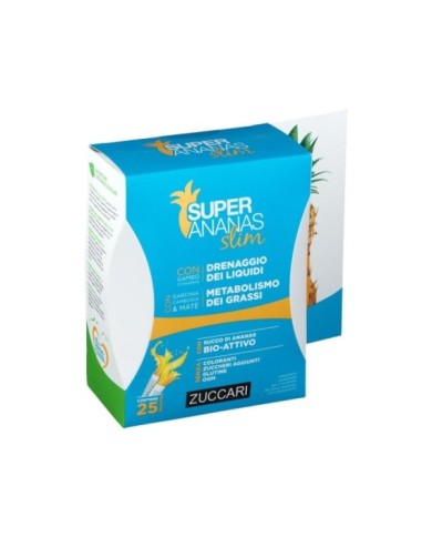 Super Ananas Slim ® è l’evoluzione del prodotto Super Ananas®, della Linea Functional Food ZUCCARI. Alla formula originale di Super Ananas® (contenente estratto di Gambo d’ananas* drenante e 334GDU di Bromelina titolata per bustina) sono state aggiunti Garcinia cambogia e Matè, riconosciuti come alleati della linea e in grado di promuovere sia il metabolismo dei grassi che l’equilibrio del peso.