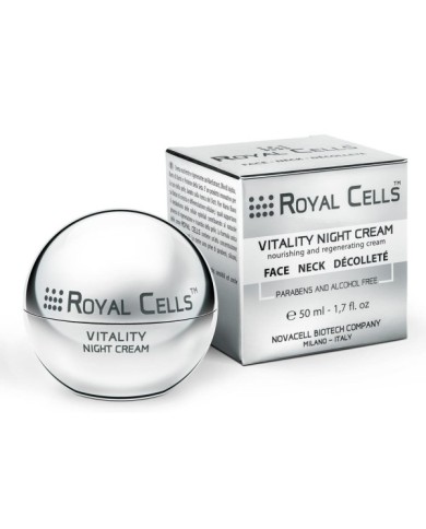 La crema ROYAL CELLS Vitality Night è una crema nutriente e rigenerante, che contiene ROE EXTRACT, Olio di Jojoba, Burro di Karité e Proteine della Seta.